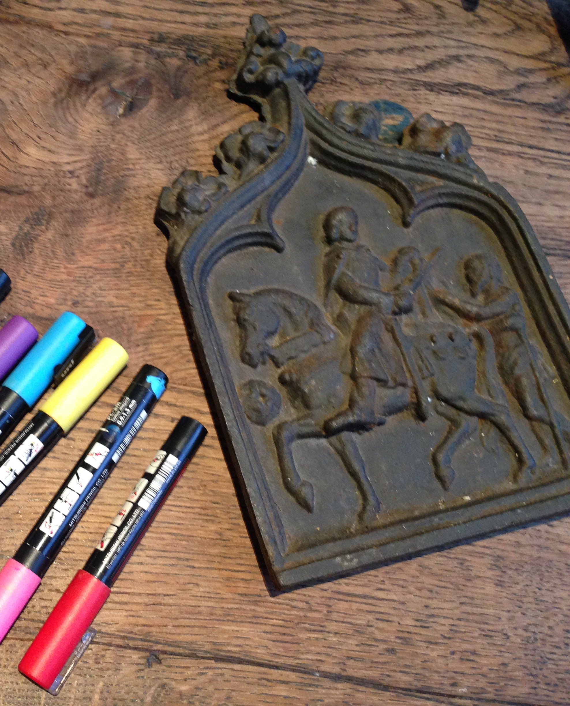 Saint-Martin, le saint qui partage au pauvre. Je trimballe cette représentation, héritage familial d’un matériau lourd et inconnu. Travail au Posca.