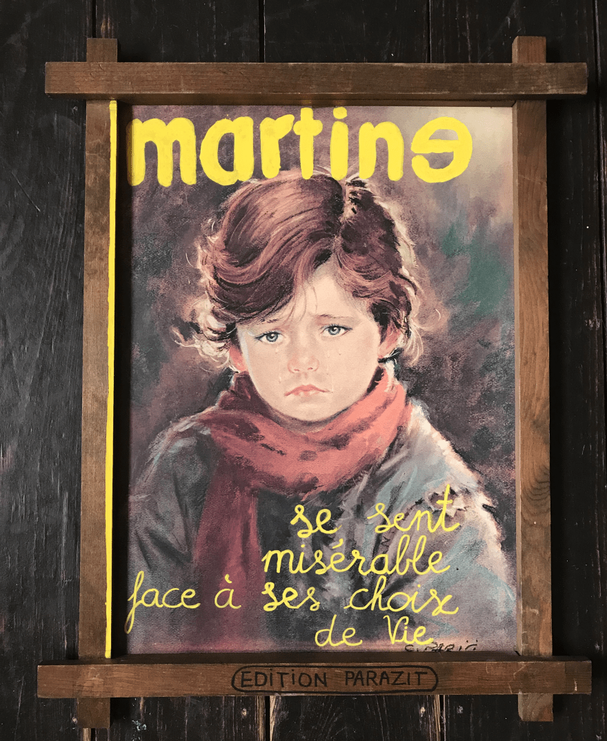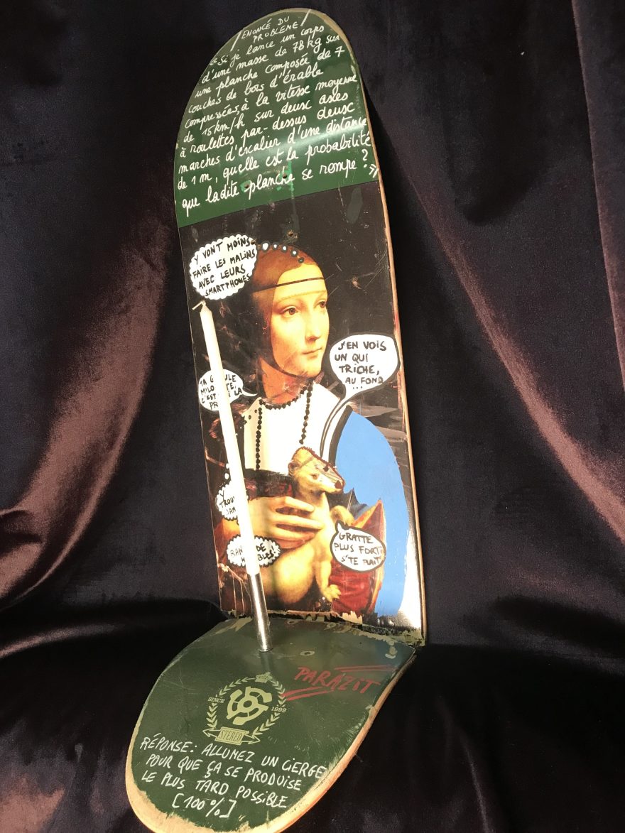 "Un parasite vit aux dépens de son hôte". Parazit est né des déchets: toiles abandonnées, skateboard (qu'il a) cassé. Le support accueille une douleur, un rêve, une fantaisie. Parazit explore une forme batarde d'art naïf, d'humour, de recyclage, présenté ici en galerie virtuelle. En rue (voir "Expositions"), ces productions prennent une dimension étrange et honorent l'oeuvre originale, changent les codes pour bousculer légèrement le spectateur.